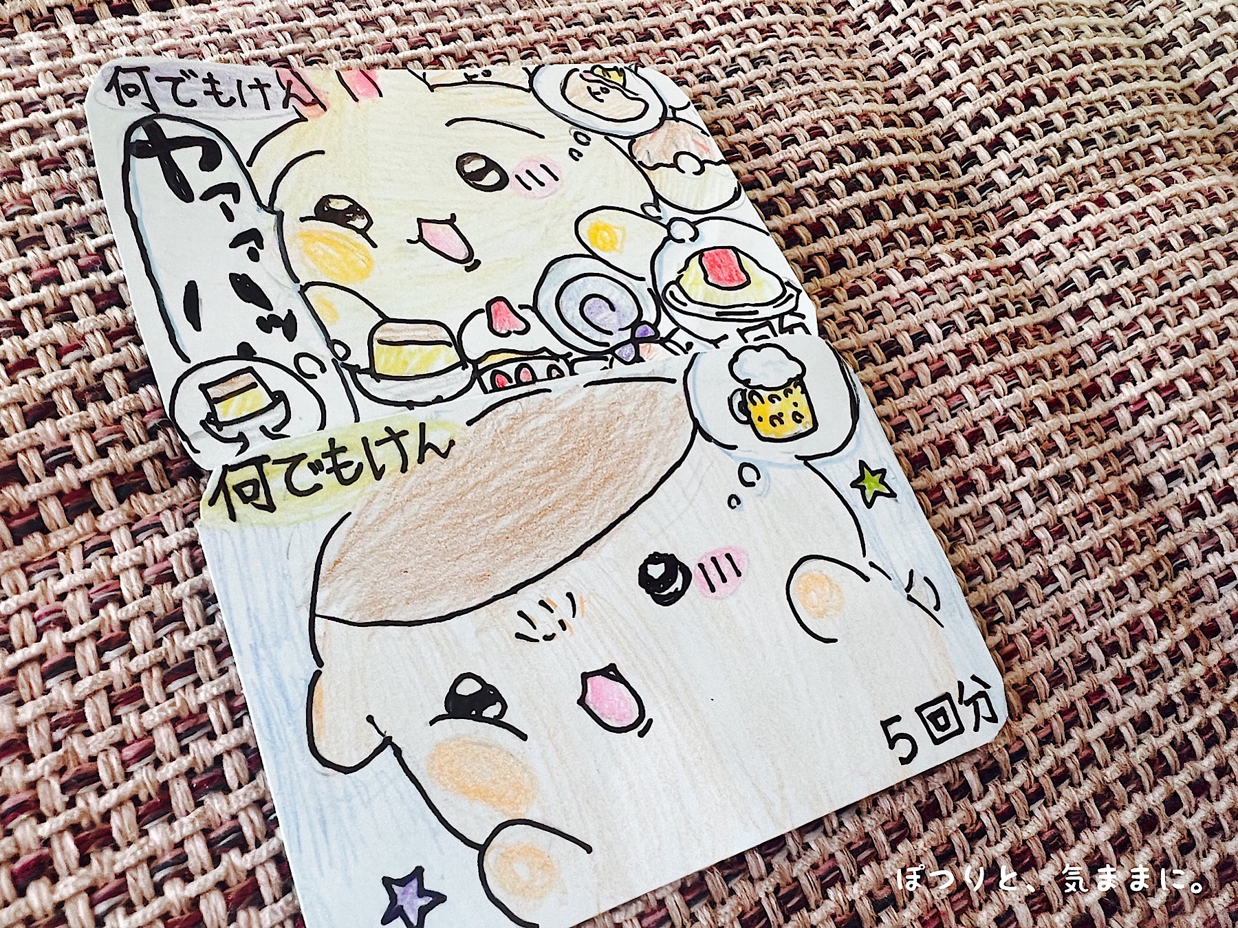 実は酒々井湯楽の里で、ちいかわのアイマスクのガチャガチャがあり、わたしも欲しくなって旦那さんのお誕生日特需ということで、500円のガチャガチャを家族4人分やりました。