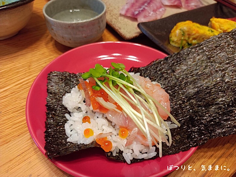 ちょっと高めの海苔に、温かいご飯を載せて、サーモンと、ブリと、甘エビと、カイワレと、イクラと載せまして、クルクルっと海苔を巻いてガブッといくよね。